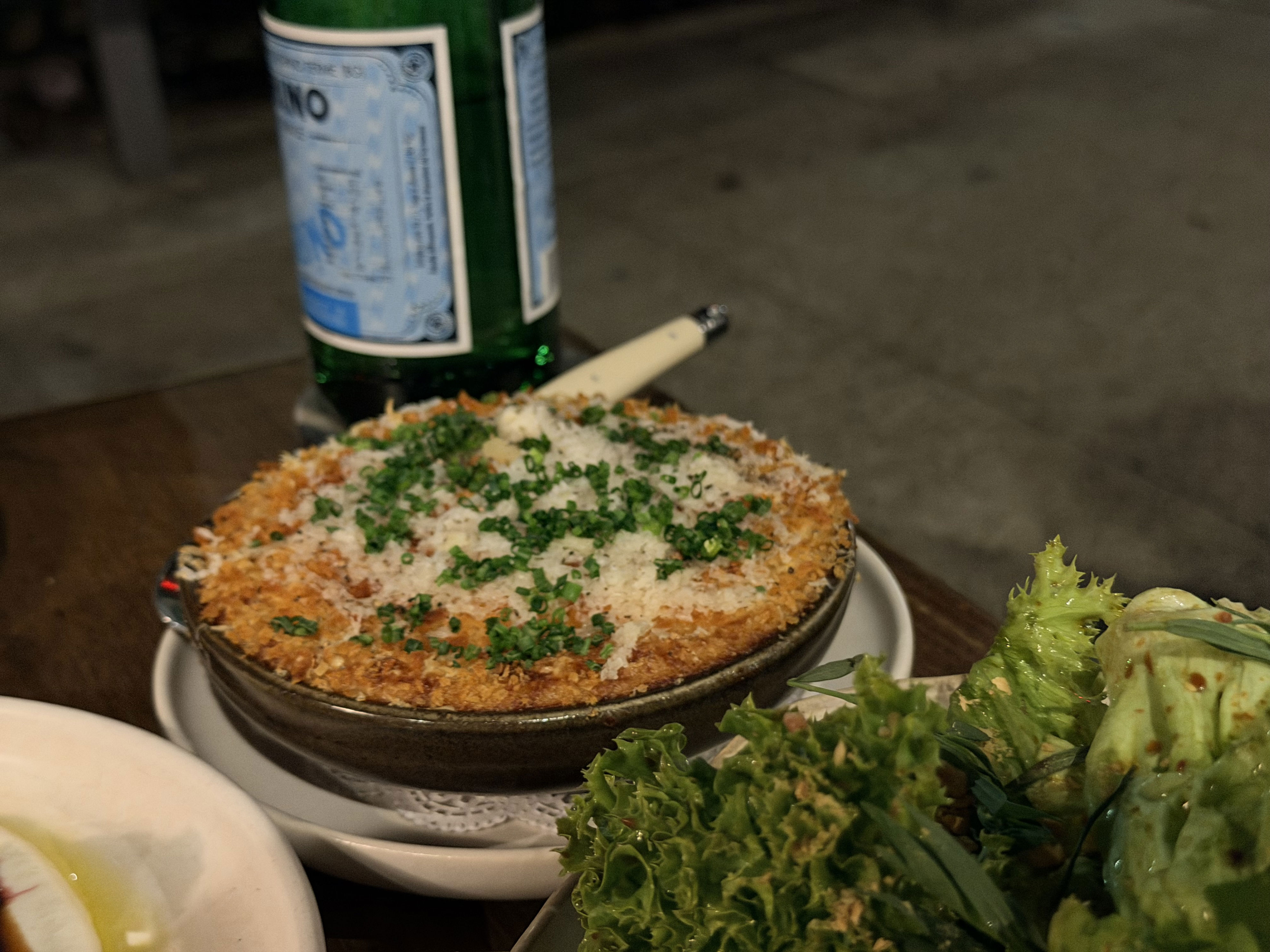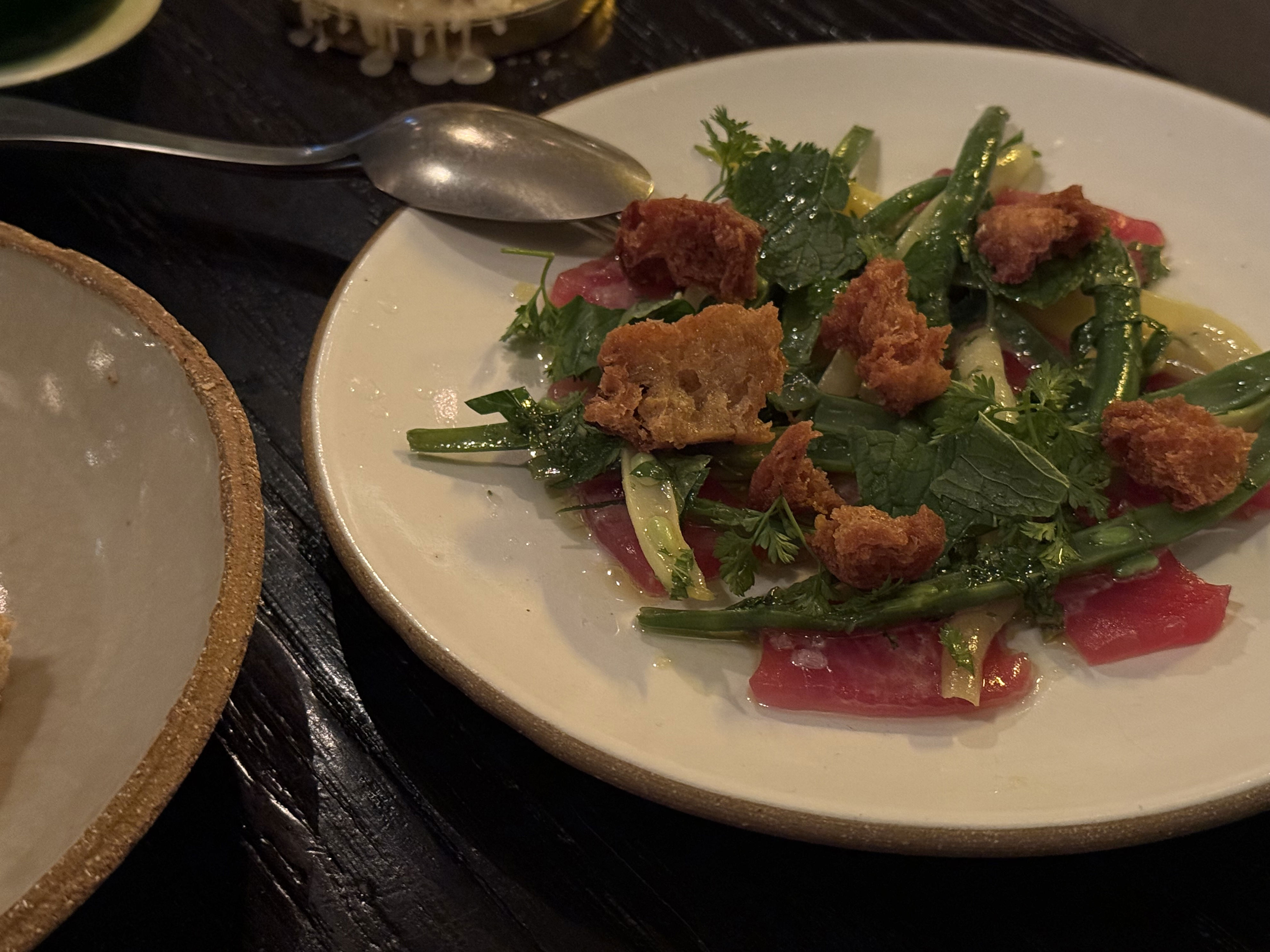 从动物园回来后,在 Circular Quay 进行了一波游客经典打卡活动,然后立刻坐火车回 King Cross 去提前预定的一家餐厅。这家两帽法餐 Fred’s,主打的是「Farm to Table」理念,于是我和桃总被狠狠地割了韭菜。我们点了 140 澳元一位的套餐,结果菜品超级齁咸,我一个绍兴人都受不了了,而且都是很普通的食材,越吃心情越差,帮大家狠狠避雷。