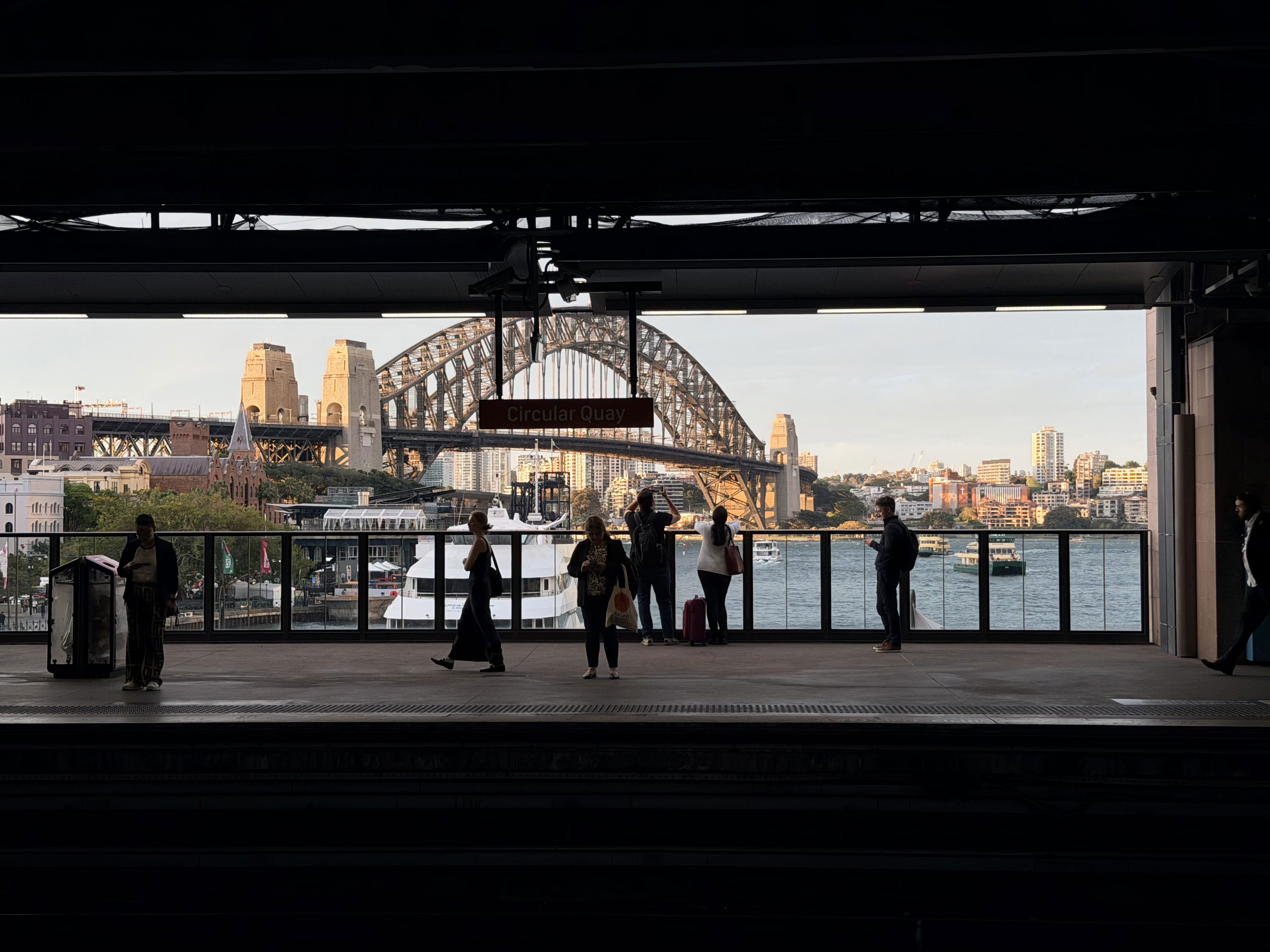 当我们离开 The Rocks,准备从 Circular Quay 的火车站坐火车离开时,原本灰蒙蒙的天空突然划开了一道口子,一道金光正好撒在了悉尼歌剧院上,将原本的白色贝壳屋顶渲染成为了金色,与深蓝色的海水相映衬,格外美妙。随即我们又走上了 Circular Quay 火车站的月台,在这个被誉为「南半球最美车站」的地方,捕捉下了一个个美妙的瞬间。