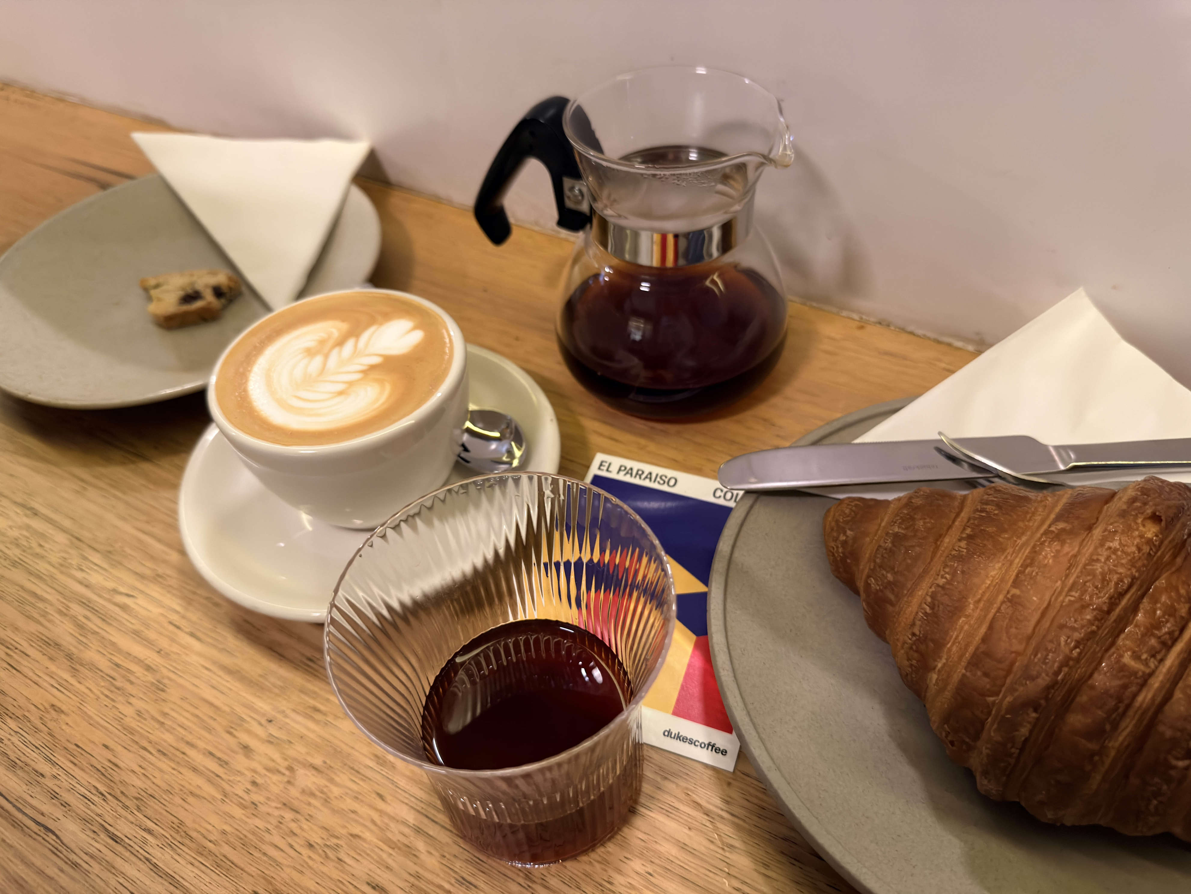 第一天的 Brunch 我们去了 Dukes Coffe Roasters。我点了一份 9 澳元的哥伦比亚 filter coffee,换算成人民币比沪币还便宜,手冲也非常不错,充分还原了这支浅烘焙豆子的果感。至于可颂和小饼干,就有点凑数的感觉了。